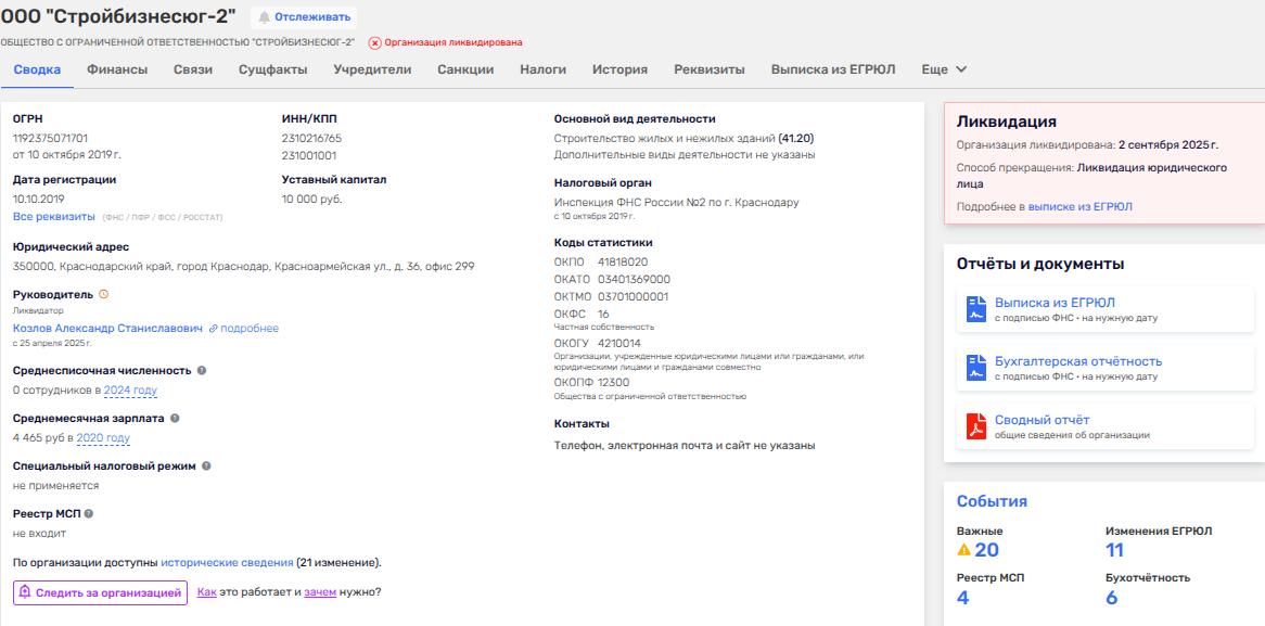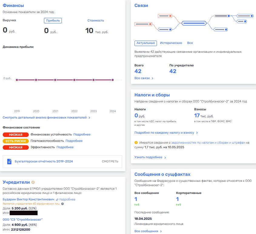В сентябре 2025 года было ликвидировано ООО «Стройбизнесюг-2», учрежденное в 2019 году, и ныне - строительная дочка компании ООО «Стройбизнесюг» и лично Бударина. При этом фирма все годы существования демонстрировала нулевую выручку и нулевую же прибыль, но ликвидировали ее лишь сейчас. Почему? Об этом сообщает MEDIA EXPERT