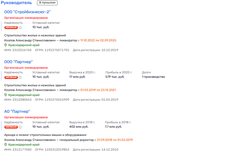 Козлов выступал руководителем и ликвидатором строительного ООО «Партнер», которое принадлежало ООО «Бизнес - Инвест» Бударина. Помимо Бударина, в числе владельцев было и АО «Ростовское» (бывшее ФГУСП "Ростовское" Минобороны России).