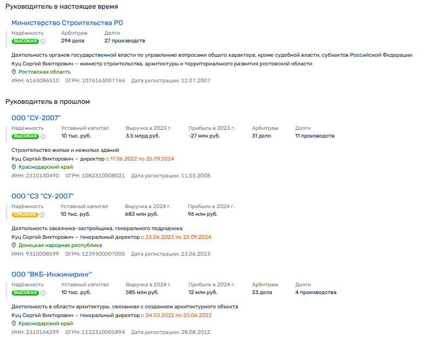 И, кстати, в дивизионе «ВКБ-Новостройки», а именно в бударинской ООО «ВКБ-Инжиниринг» наследил Сергей Куц, занимавший пост директор. На сегодня Куц у губернатора Ростовской области Слюсаря отвечает за строительство, будучи министром. Ранее Куц рулил ведомством при Голубеве, но потом сходил в бизнес и, как мы видим, вернулся на госслужбу. Но, видимо, старого босса от стройки Бударина не забывает - фирмы дивизиона Бударина получают госконтракты и в Ростовской области.