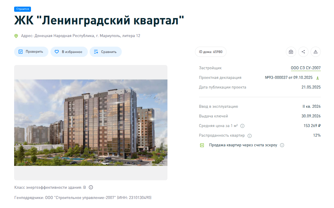 Застройщиком ЖК «Ленинградский квартал» в Мариуполе, утвержденным на уровне российского правительства, оказалось ООО СЗ «Су-2007», созданное в июне 2023 года. Оно и принадлежит ООО «Су-2007» и Александру Зенцеву, который владеет и «Су-2007».