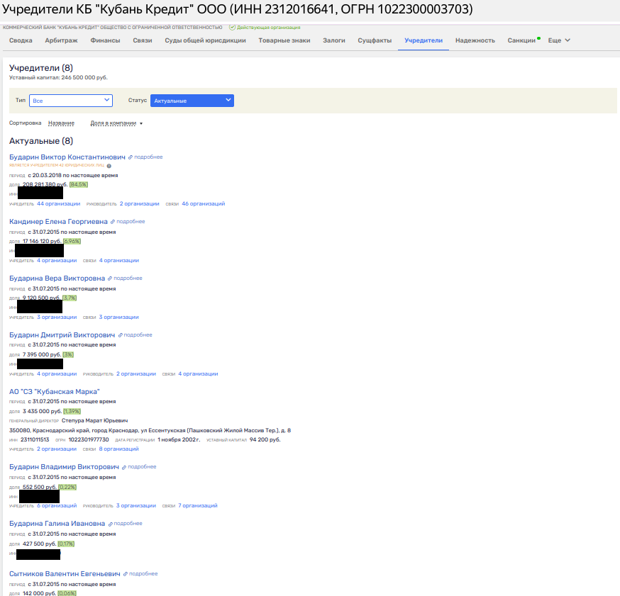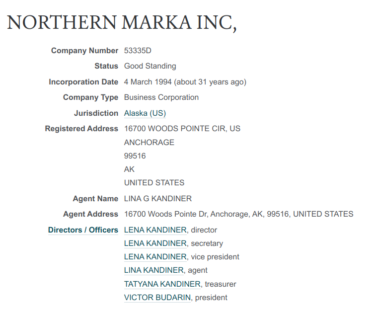 В американском регистре с 1994 года присутствует NORTHERN MARKA INC (переводится как Северная марка), в руководстве которого как сам VICTOR BUDARIN, так и LENA KANDINER. Последняя - тёзка супруги кубанского банкира и вместе с ним, а также другими членами семьи она владеет долей в банке «Кубань Кредит».
