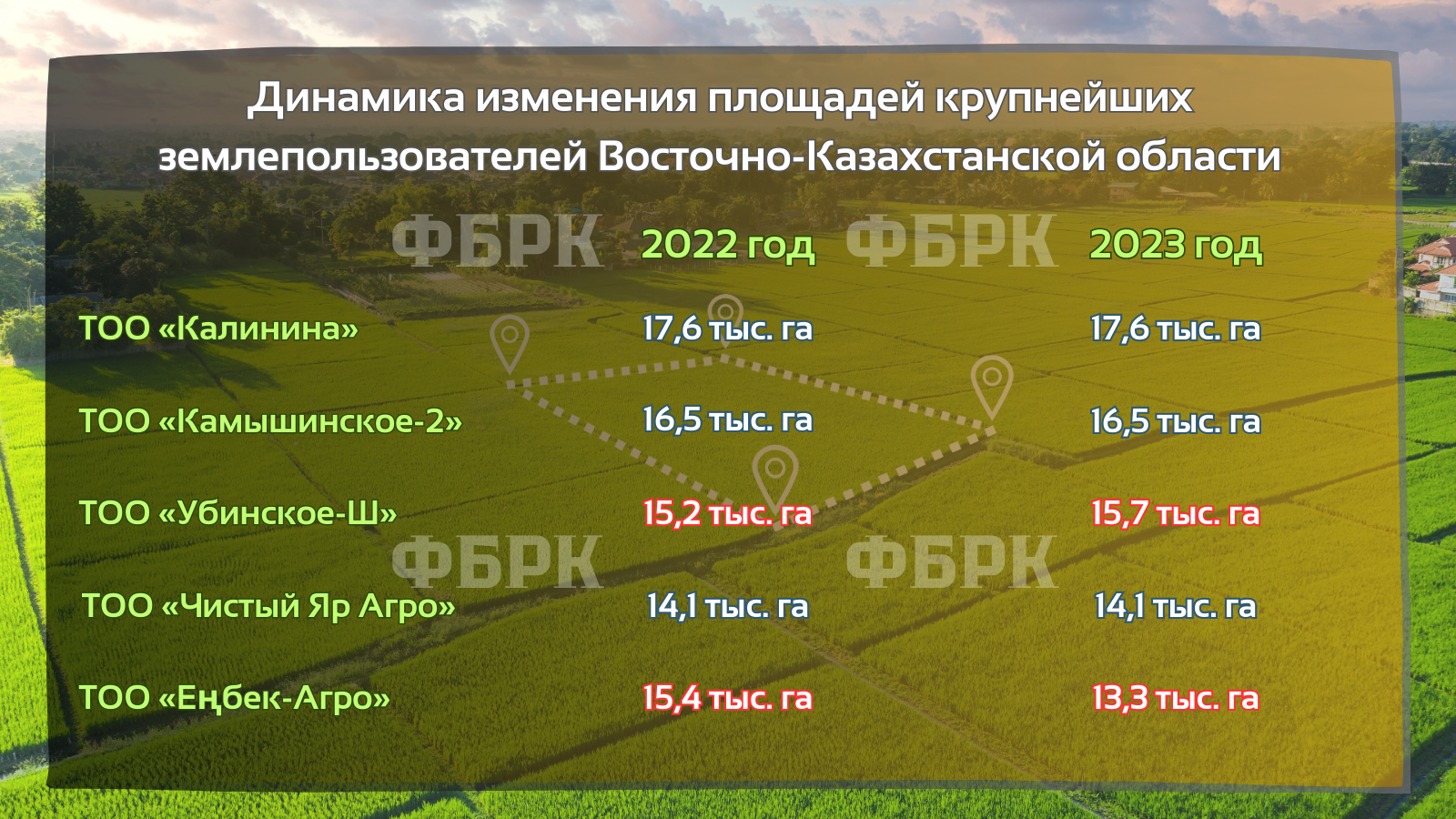 Напомним, редакция ФБРК анализирует динамику крупнейших землепользователей Казахстана с целью выяснить, какое количество сельскохозяйственных земель было изъято у них за последнее время.